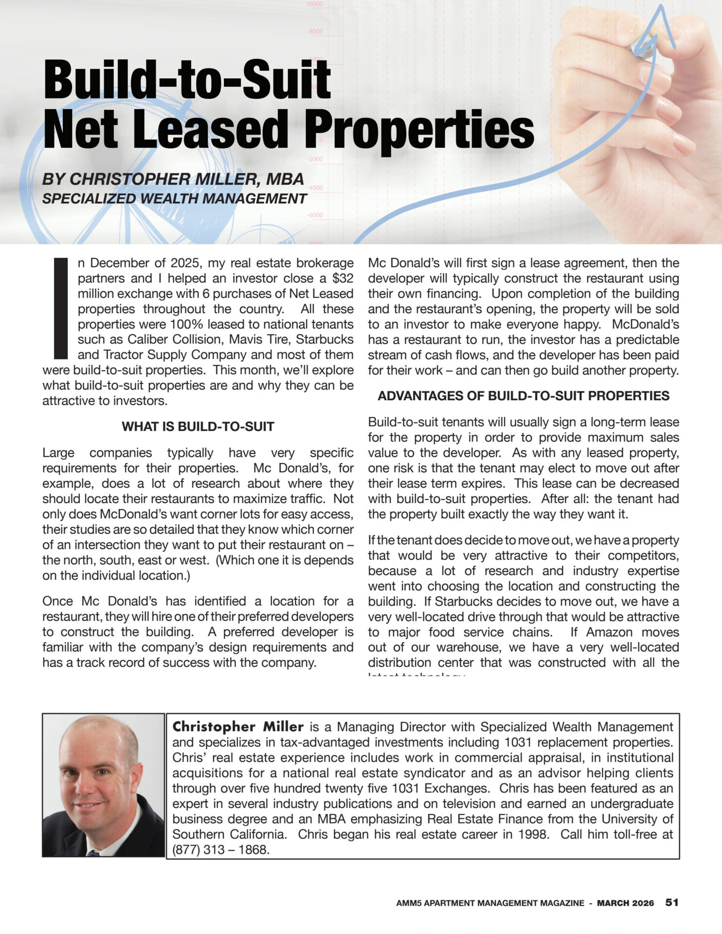 In December of 2025, my real estate brokerage partners and I helped an investor close a $32 million exchange with 6 purchases of Net Leased properties throughout the country. All these properties were 100% leased to national tenants such as Caliber Collision, Mavis Tire, Starbucks and Tractor Supply Company and most of them were build-to-suit properties. This month, we’ll explore what build-to-suit properties are and why they can be attractive to investors.